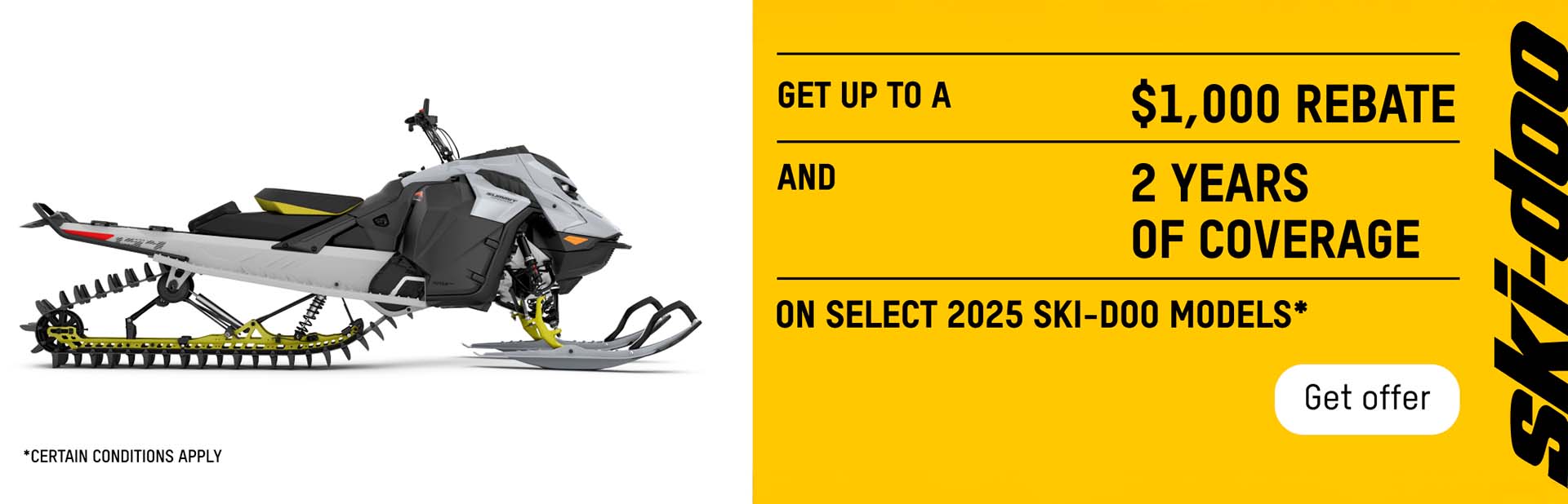 ©2026 Bombardier Recreational Products Inc. (BRP). All rights reserved. ®, ™ and the BRP logo are trademarks of BRP or its affiliates. Offers valid in Canada at participating dealerships only from April 1, to July 31, 2026. Conditions may vary depending on your location and this offer is subject to termination or change at any time without notice. This offer is not refundable, exchangeable or transferable (including from one dealership to another), cannot be redeemed for cash, credit or other products of equivalent value and cannot be combined with any other offer or rebate. Null where prohibited by law. Until supplies last. Returns of any portion of the purchase will require equal forfeiture of offer or amount equal to the offer. Eligible models are all new and unused 2025 Full-Sized Ski-Doo and Lynx Snowmobiles. Other snowmobile models may qualify for other promotions, see local dealers for details.